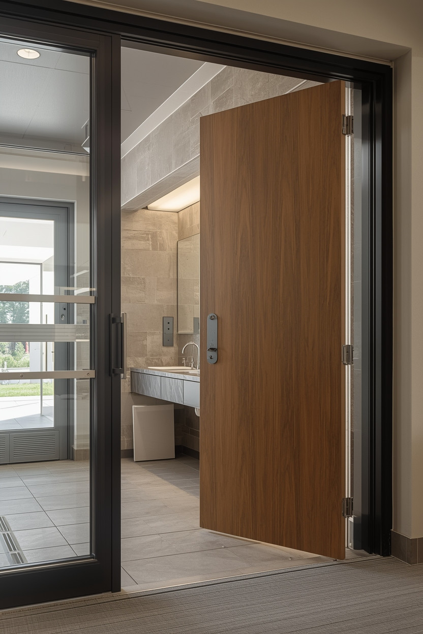 Modification of door openings and installation of ADA-compliant hardware including lever handles, closers, panic devices, and clearances for accessible operation.